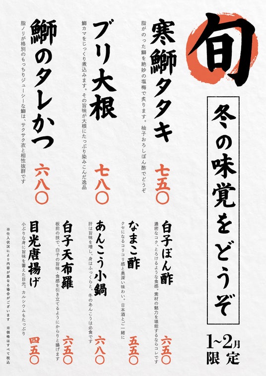 脂がのった寒ブリは必食!1・2月旬メニュー
