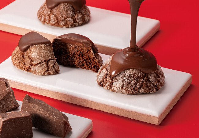 濃厚なコクたっぷりのショコラバタークッキーにココアパウダーを練り込んだなめらかなホイップショコラをとじこめ、さらに上からスイートチョコレート入りのコーティングチョコをとろりと流しかけました。