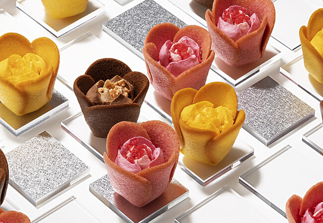 代表作『チューリップローズ』は、可愛いチューリップと華やかなローズがひとつになった、とびきりよくばりなスイーツです。チューリップの花びらは、シャリシャリッと繊細なラングドシャクッキー。香り高いローズの花は、とろけるショコラクリーム仕立て!ストロベリー&ラズベリーが甘酸っぱい『ベリー』、深みあるキャラメルマキアートのコクが広がる『キャラメルナッツ』、楽園のパッションフルーツ&マンゴー香る『パッションマンゴー』の3種類。一輪ごとに贅沢な美味しさが口いっぱいに広がる、まさに“スイーツの花園”を楽しめる一品です。