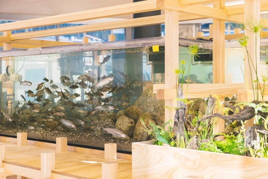 杭や金属を使わない三方格子の構造を取り入れ、木のぬくもりを感じられるキッズルームを設置しています。人の可能性を信じ、挑戦を後押しするヤンマーの「HANASAKA」の価値観を体現し、子どもたちが楽しみながら学べる本や、魚と植物が共生できる仕組み「アクアポニックス」など、木育や食育、自然循環の仕組みについて学べる空間となっています。