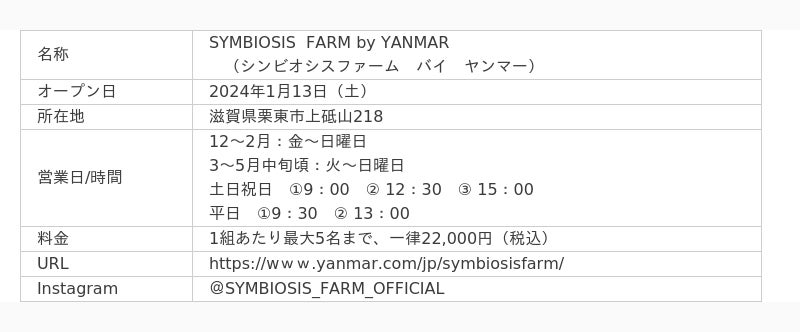 ヤンマーホールディングスのグループ会社であるヤンマーシンビオシス株式会社(以下、ヤンマーSS)は、これまで自社農場として運営していた滋賀県の栗東センター内に、地域資源を活用して子どもたちにワクワクする体験と学びを提供する新しいスタイルの観光農園「SYMBIOSIS FARM by YANMAR(シンビオシスファーム バイ ヤンマー、以下本施設)を2024年1月13日(土)にオープンします。