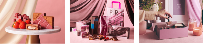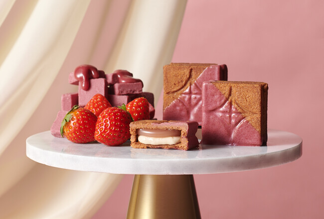 福岡県産あまおう苺を使った苺バターキャラメルに、香りと風味のバランスがよい、カカオ分70%のクーベルチュールから作られたショコラバタークリームを挟むことで、苺の華やかな甘さにショコラの濃厚な香ばしさが合わさる心地よい味わいに仕上げました。バレンタインシーズン用にデザインされた、クラシックピンクをベースにデザインされたパッケージもお楽しみください。