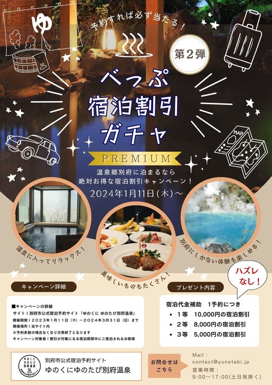 一般社団法人 別府市産業連携・協働プラットフォーム B-biz LINKが運営する別府市公式宿泊予約サイト[ゆのくにゆのたび別府温泉]は、サイト内における別府市内の宿泊施設を対象とした大変お得な【第2弾】べっぷ宿泊割引ガチャキャンペーンを2024年1月11日(木)より開始いたします!