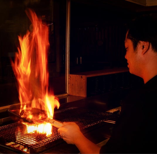 オープンキッチンから火柱が!看板メニューの「炭火かご焼き」は、炭火に鶏油をかけながら鶏肉を豪快に焼き上げることにより、炭の色や香りがついた宮崎県の名物料理。鶏もも、砂肝、ぼんじり、レバーなどから好きな部位を選び、注文が入るごとに都度焼いていきます。