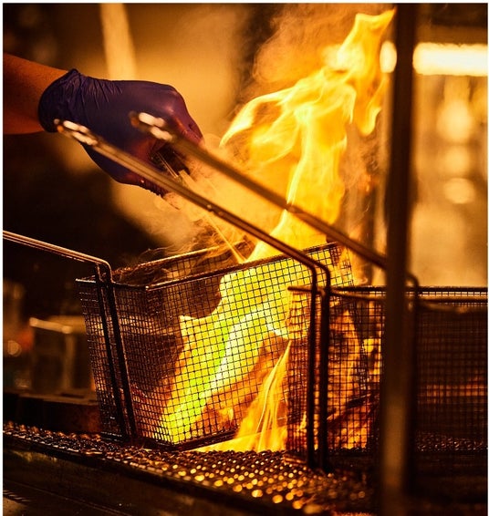 炭火に鶏油をかけながら豪快に焼き上げることで、炭の色や香りを纏います。枡(マス)に温めた鉄を入れ、その上に商品を乗せて提供するのでアツアツの状態で楽しめます