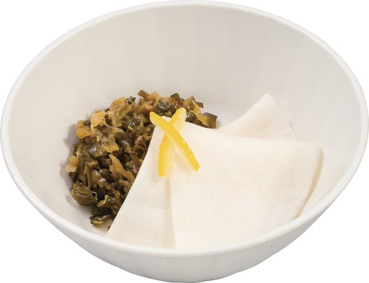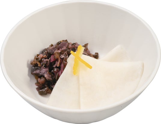 伝統の京野菜「聖護院かぶら」を薄く切り、北海道産の昆布で1枚1枚丁寧に漬け込んだ“西利の千枚漬”を使用した一品です。