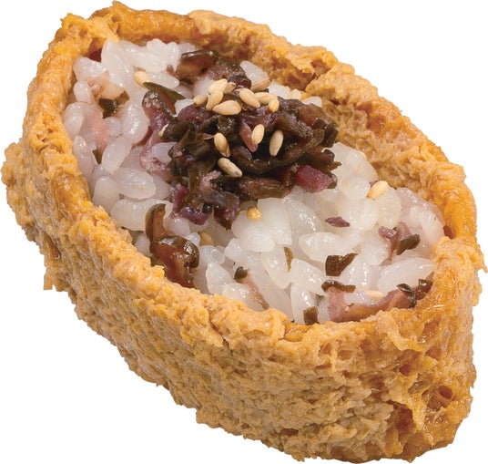 “ゆかりむらさき”といりごまを混ぜ込んだ舎利を、油揚げを裏返しにして包む「裏巻き」で仕上げました。「裏巻き」のふっくらした食感や油揚げの甘じょっぱさ、“ゆかりむらさき”の風味など、絶妙な味わいをお楽しみください。