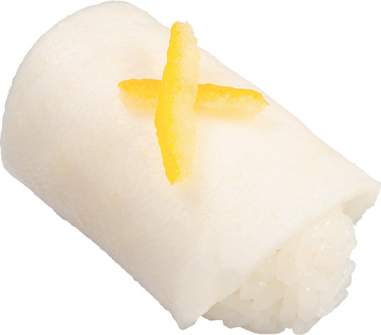 かっぱ寿司こだわりの舎利を、きめ細かな食感とみずみずしい風味の千枚漬(1/2枚)でくるみ、柚子をあしらいました。