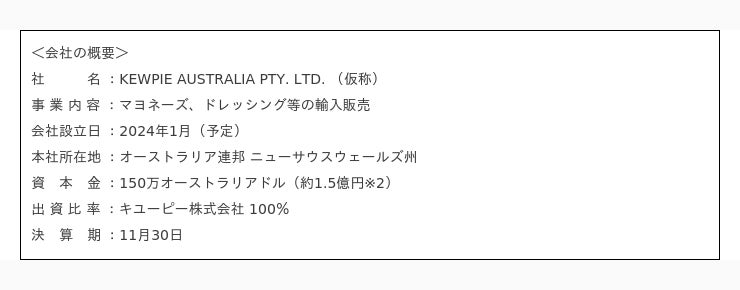 キユーピー株式会社(本社:東京都渋谷区、代表取締役 社長執行役員:高宮 満、以下キユーピー)は、オーストラリアにおけるキユーピーグループ商品の販売拠点として、オセアニア地域初の現地法人を設立します。新設会社では、KEWPIE (THAILAND) CO., LTD. (以下キユーピータイランド)で製造したマヨネーズやドレッシングなど、サラダ調味料を中心に販売します。販売会社の新設により、オーストラリア国内で需要が高まるキユーピーグループ商品の販売強化とブランドのさらなる浸透を目指します。営業開始は2024年7月を予定しています。