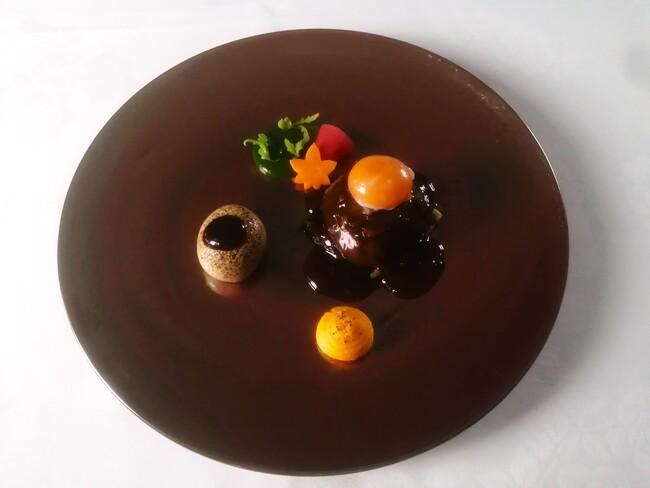 千葉県の根菜とイノシシのカネロニ仕立て 味噌風味の赤ワインソース
