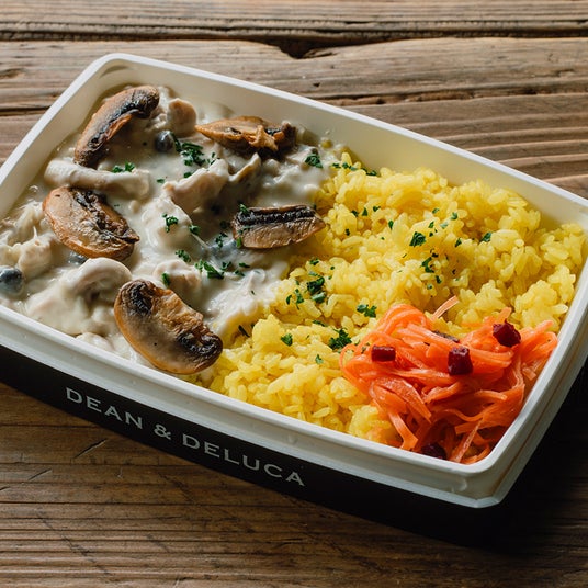 素材の持ち味やコク深さをたのしめる、ホワイトソース仕立てのウクライナ流ポークストロガノフ。豚肉、たまねぎ、マッシュルーム、しめじに、生クリームとチーズのミルキーなうまみ、そして白ワインの爽やかな酸味を少量加え、こっくりと煮込みました。ターメリックバターライスに、深紅のビーツをトッピングしたオレンジラペが、まろやかなおいしさに華を添えます。