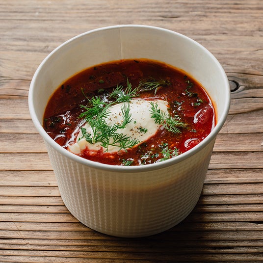 ウクライナ発祥のボルシチは、日本の味噌汁のような家庭料理。食べやすく刻んだビーツ、キャベツ、たまねぎ、にんじん、じゃがいもをたっぷり使い、繰り返し食べたくなるやさしい塩加減で仕あげました。野菜のおいしさが溶け込んだビーツ由来の深紅のスープに、サワークリームのコクと酸味、ディルとパセリのさわやかな風味を合わせてお召し上がりください。