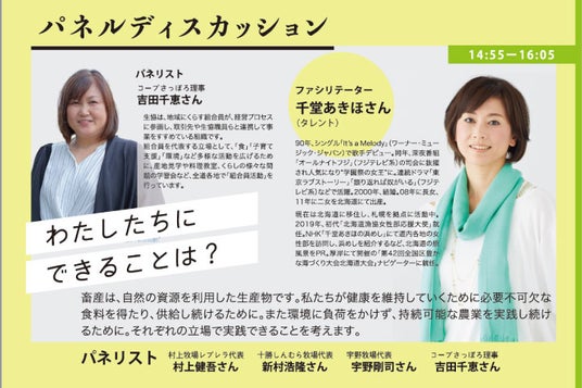 畜産は、自然の資源を利用した生産物です。私たちが健康を維持していくために必要不可欠な食料を得たり、供給し続けるために。また環境に負荷をかけず、持続可能な農業を実践し続けるために。それぞれの立場で実践できることを考えます。・ファシリテーター千堂あきほさん(タレント)