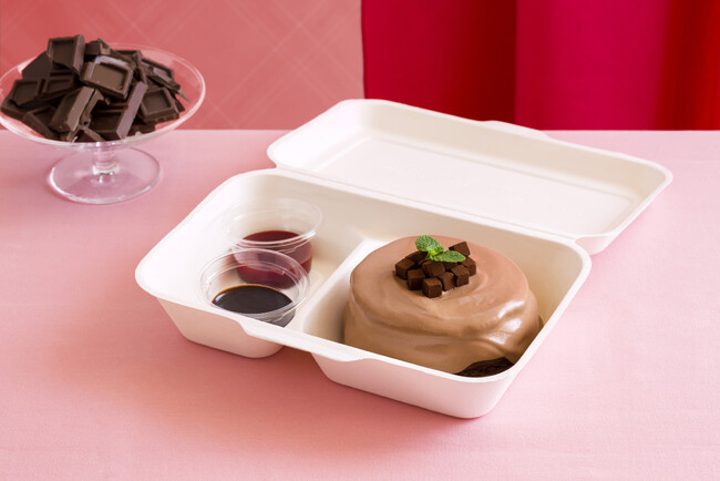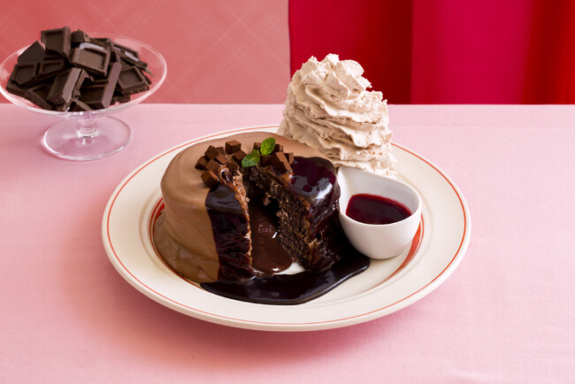 チョコレートのクリームに包まれたココア生地の中から温かいチョコガナッシュが溢れるチョコレート尽くしのパンケーキ。チョコをさらに引き立てるストロベリーソースを添えました。