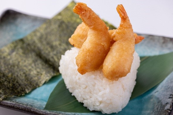 自家製のだし醤油を絡めた海老を積み上げたご馳走おにぎり