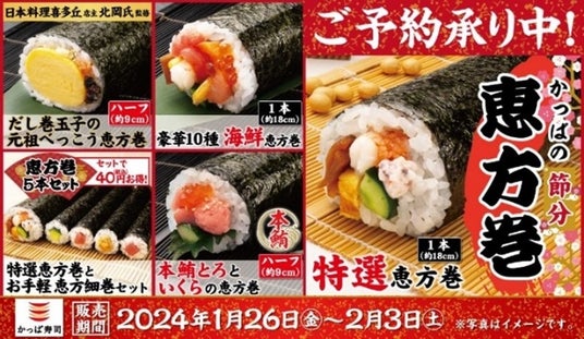 2024年は、かっぱ寿司人気の「いかサラダ」(サラダ軍艦のネタ)が入ったかっぱ寿司の恵方巻定番商品である『特選恵方巻』、広島を代表する日本料理店「日本料理 喜多丘」の店主 北岡三千男氏に監修いただいた『だし巻玉子の元祖べっこう恵方巻』、最高級品「本鮪」を堪能できる『本鮪とろといくらの恵方巻』、海鮮など10種の具材を贅沢に使用した『豪華10種 海鮮恵方巻』の他、定番メニューの細巻を『恵方細巻』として一本で提供するお得なセットをご用意しております。