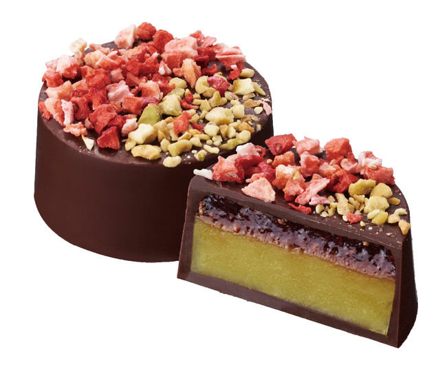 香り高いピスタチオガナッシュに甘酸っぱい苺のソース。フリーズドライ苺とピスタチオローストを飾って。
