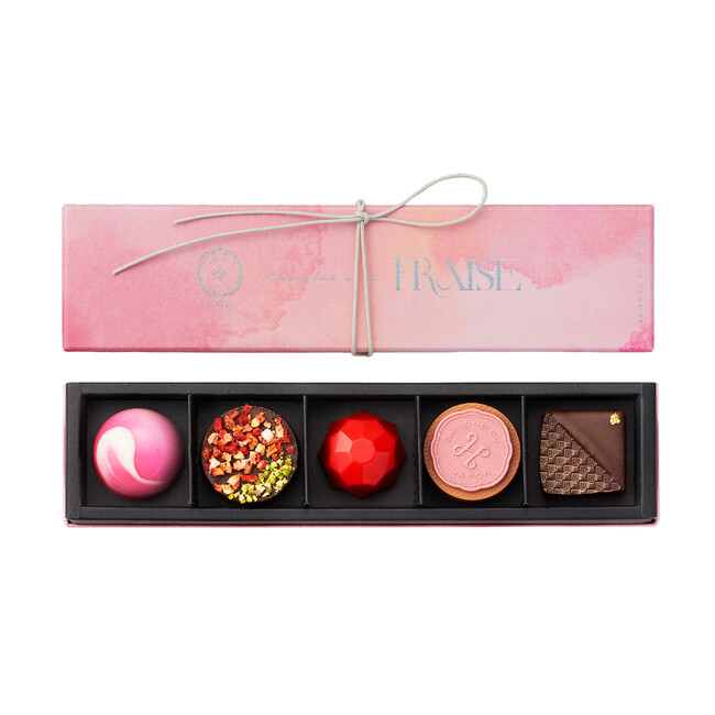 苺の魅力を堪能する華やかなショコラの詰め合わせ。苺の甘酸っぱい香りとフルーティーな果汁を、北海道産生クリームや芳醇な香りのシャンパンとあわせて多彩な味わいに仕上げました。苺の美味しさを詰め込んだ贅沢なひと箱です。