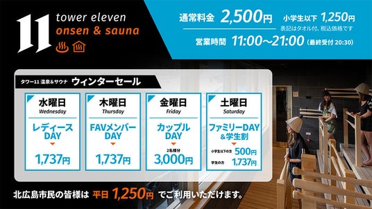 対象の方は直接「tower eleven onsen & sauna」フロントまでお越しいただき、その場で「ウィークリープログラム」をご利用の旨をお伝えいただき、ご決済後ご入浴いただけます。