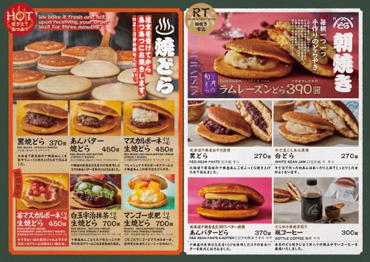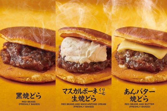 これまでの商品に改良を加えた焼どら。北海道産小豆を使用した甘すぎないあんこをそのまま挟んだ王道の「黒焼どら」。高品質マスカルポーネと北海道産フレッシュクリームを合わせた濃厚でなめらかな生クリームとあんこを挟んだスイーツのような「マスカルポーネクリーム生焼どら」。北海道十勝産の良質な生乳を100%使用したコクのあるバターを贅沢に挟んだ食べてる途中でどんどんバターがとろけていく「あんバター焼どら」。