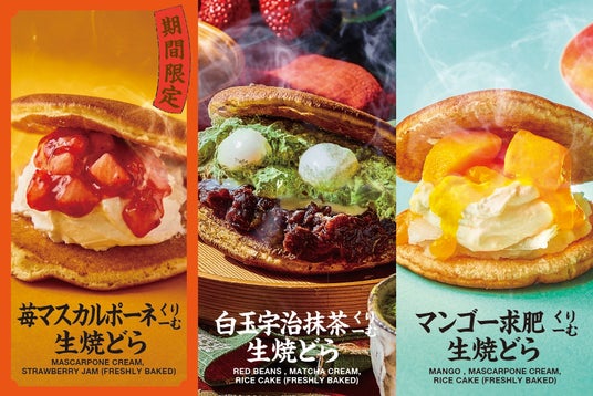 期間限定商品としていちごソースとマスカルポーネクリームを挟んだ「苺マスカルポーネクリーム生焼どら」を展開。あんこが苦手な方でもふかふかなどらやきが食べたい!という方はぜひこちらがおすすめ。まるで手乗りのパンケーキを食べてるようでぺろりと食べれちゃう。