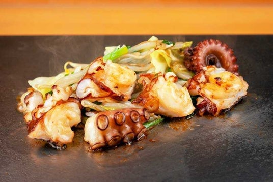 鬼殻エビのガーリック焼きや門崎和牛熟成赤身鉄板焼きをはじめ豚ねぎ焼き又はお好み焼き海鮮一種・ブタ焼きそば等を堪能いただけます。