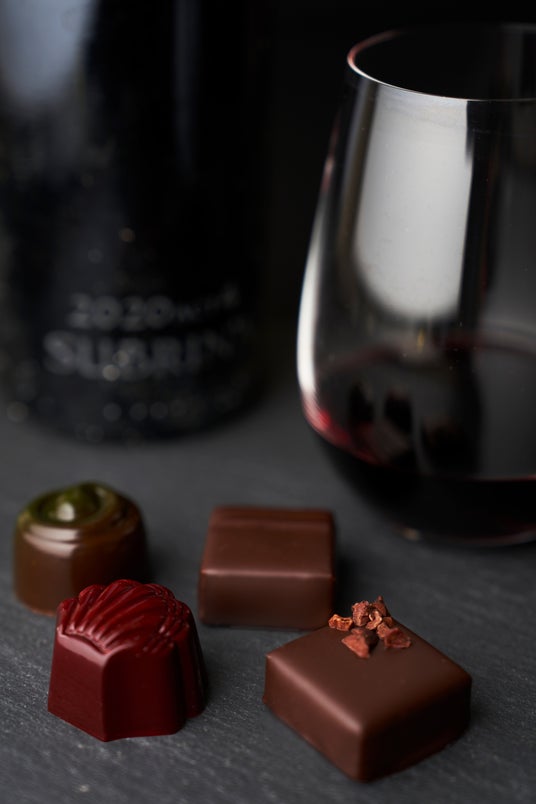 一粒一粒が異なる香りと味わいを持つ4種のボンボンショコラを、それぞれSUBRINAワインと一緒に味わうことで、ワインとショコラが口の中で溶け合い、何層にも重なり合った複雑な風味が互いを引き立てます。