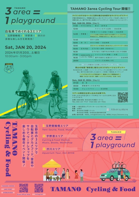 イベント期間中、玉野競輪場エリア、宇野港エリア、渋川エリアの3つのエリアを自転車でめぐりながら楽しめるサイクリングツアー「TAMANO Cycling & Food」(一般社団法人デスティネーションせとうち主催)が開催されます。