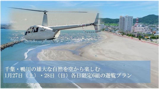 空のモビリティプラットフォームを開発する株式会社AirX(本社:東京都千代田区、代表取締役:手塚 究、以下「AirX」)は、千葉県の鴨川に根付く下記4社、鴨川温泉「璃庵」を運営する有限会社魚眠庵マルキ本館(本社:千葉県鴨川市、代表取締役:久根崎 達郎、以下「魚眠庵マルキ本館」)、株式会社千葉銀行(本社:千葉県千葉市、取締役頭取:米本 努)、ちばぎん商店株式会社(本社:千葉県千葉市、代表取締役:小野 雅康、以下「ちばぎん商店」)、有限会社鴨川タクシー(本社:千葉県鴨川市、代表取締役:本多 信介、以下、「鴨川タクシー」)と連携し、チャーターヘリ付き鴨川温泉「璃庵」宿泊プランと鴨川のまちを一望できるヘリコプター遊覧プランを、昨年に続き、今年も開催することをお知らせいたします。