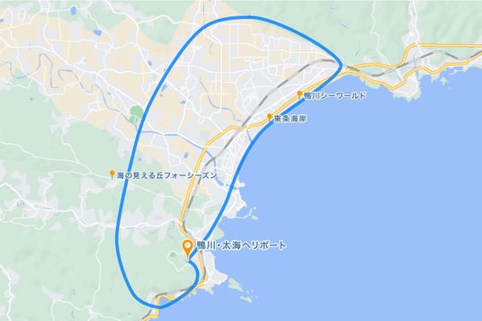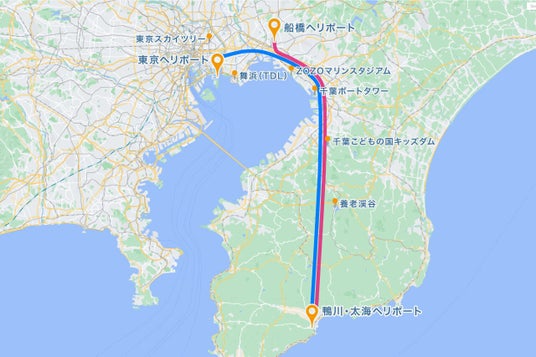 ■ 離発着場所鴨川・太海ヘリポート〒299-2862 千葉県鴨川市太海1717 城西国際大学安房キャンパス跡地東京ヘリポート〒136-0082 東京都江東区新木場4-7-41船橋ヘリポート〒273-0853 千葉県船橋市金杉1丁目44