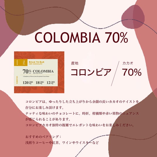 コロンビアは、ゆったりした立ち上がりから余韻の長いカカオのテイストを存分にお楽しみ頂けます。ナッティな味わいのチョコレートに、時折、柑橘類や赤い果物のニュアンスが感じられることがあります。コロンビアカカオ独特の複雑でエレガントな味わいをお楽しみください。