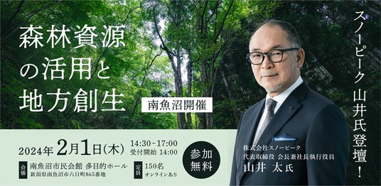 そんな南魚沼市の森林資源活用に焦点を当て、新潟を代表するアウトドアブランドを展開する株式会社スノーピーク 山井氏、新潟ベンチャー協会 渋谷氏、南魚沼森林組合の経験を持ち自らカーボンクレジット事業を創業した株式会社Forest Folks 桜井氏、老舗米農家から森林課題にアプローチする株式会社庄治郎商会 原澤氏、南魚沼市 林市長が登壇し、「森林資源の活用×地方創生ビジネス」の可能性について考えるイベントを開催します。ぜひ、みなさまのご参加をお待ちしております。【参加無料】