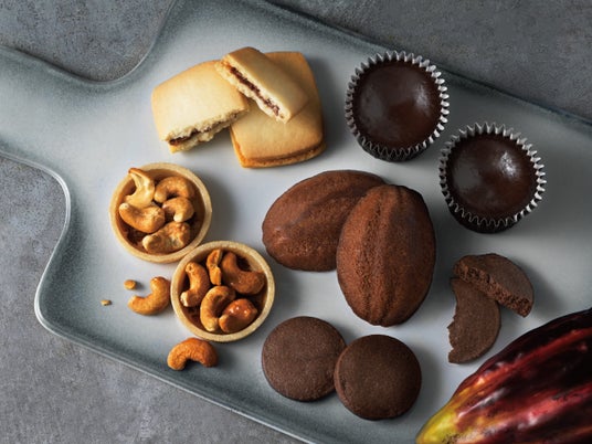 プラリネショコラクリームを挟んだアマンドサブレと、しっとり焼き上げたカカオ香るマドレーヌのアソート。