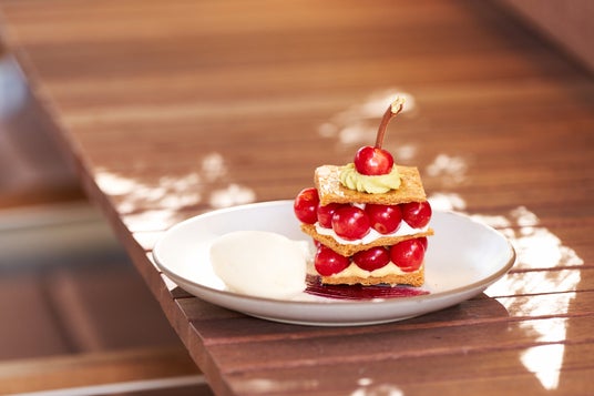 キャラメリゼしたパイ生地に、カスタードクリーム、ピスタチオクリーム、カシスソース合わせたミルフィーユ。ミルフィーユの中に「佐藤錦」をたっぷりとサンドした華やかな一皿です。