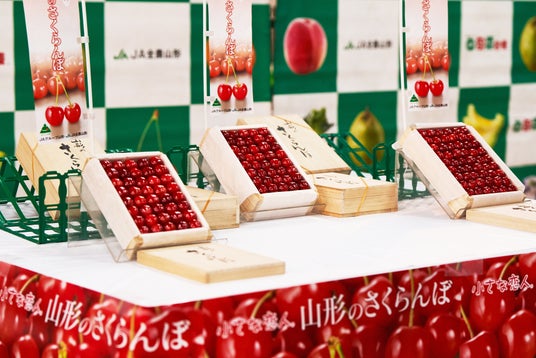 競売にかけられた初物の山形県産さくらんぼ「佐藤錦」