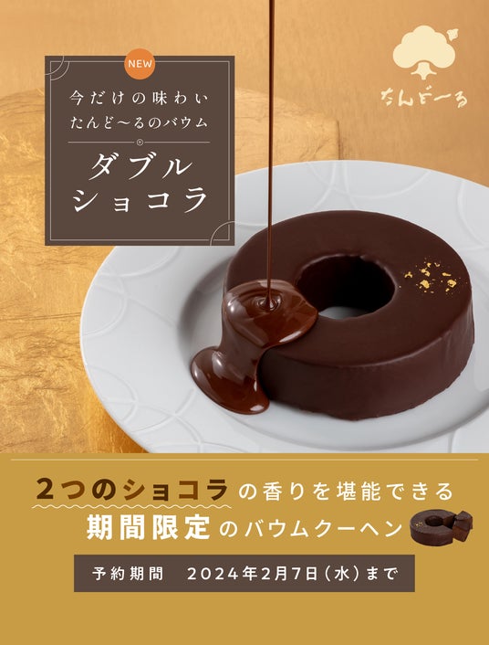 今だけの味わい「ダブルショコラ」カカオ70%のビターなチョコレートを生地に練り込み、一層一層丁寧に焼き上げました。仕上げにカカオ56%のスイートチョコレートを全面にコーティング。