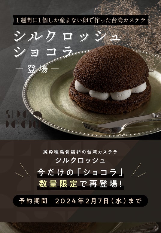 希少な純粋種烏骨鶏卵を100%使用した台湾カステラ「シルクロッシュ」にショコラ味が登場です。生地には、烏骨鶏卵の香りを活かす厳選されたココアを使用しています。烏骨鶏の濃厚な卵の風味と、コクのあるショコラのマリアージュは今だけのおいしさ。真っ白な生クリームと、ショコラ色の台湾カステラのコントラストが美しくなるよう配合にこだわりました。