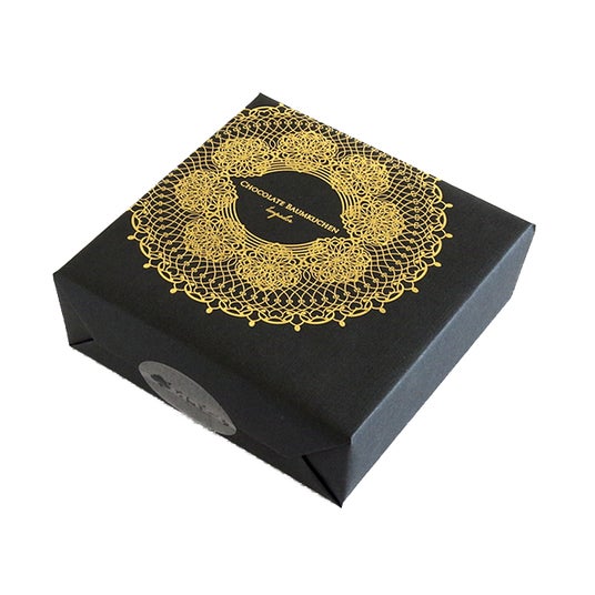 金箔をあしらい、上品な甘さの中にチョコレートの香りを閉じ込めています。パリッとしたチョコレートと、きめ細やかで、ふんわり、しっとりしたバウムクーヘンの2つの食感をお楽しみいただけます。