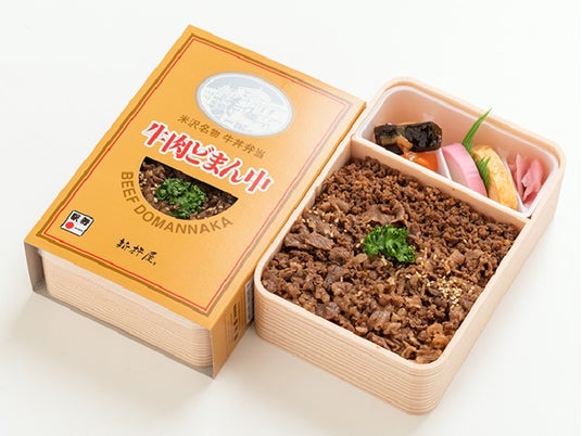 山形県産米「どまんなか」をふっくら炊き上げ、その上に特製のタレで味付けした牛そぼろと牛肉煮をのせた牛丼風のお弁当です。
