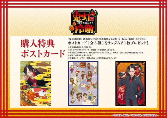 『鬼灯の冷徹』の新作グッズを含む関連商品を、2200円(税込)お買い上げごとにポストカード(全3種)をランダムで1枚プレゼント!(※彫刻ボトルとプレミアムアクリルブロックは対象外です)