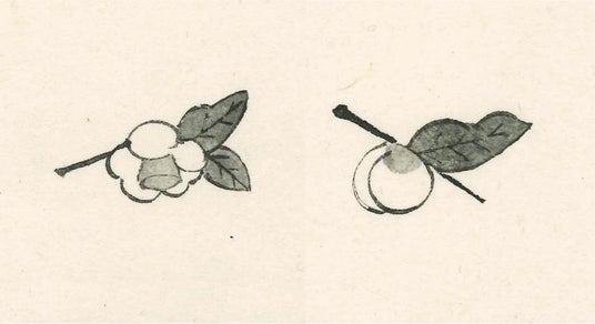 (右)月茶:深い眠りの中にあるような茶の花のつぼみが描かれた「汲出(くみだし)碗」