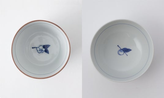 (左)日茶:眠りから目覚めたばかりのような儚げな茶の花が描かれた「蕎麦猪口」