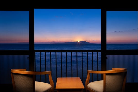 *海に昇る朝日と伊豆大島、ムーンロードを望む和室
