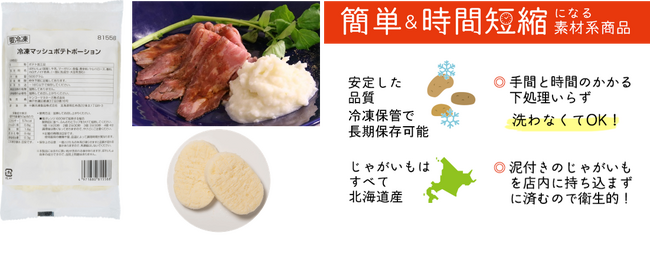『冷凍マッシュポテトポーション』は、袋を開けるだけで使えて「時間短縮」になり、料理の素材として活用できる「素材系商品」です。社会問題となっている飲食店における人手不足の解消に役立つ商品として販売を開始しました。電子レンジで簡単に解凍することができ、誰でも手軽に安心して使えます。また、ポタージュやグラタンにもアレンジが可能で、メニューの幅が広がります。