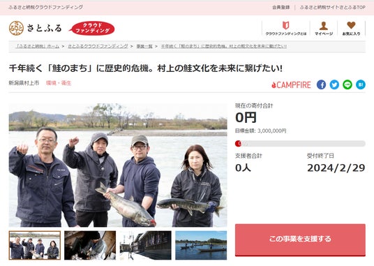 新潟県村上市とふるさと納税ポータルサイト「さとふる」を運営する株式会社さとふる(本社:東京都中央区、代表取締役社長 兼 CEO:藤井 宏明)は、「さとふるクラウドファンディング」にて、「千年続く『鮭のまち』に歴史的危機。村上の鮭文化を未来に繋げたい!」の寄付受け付けを2024年1月15日より開始します。