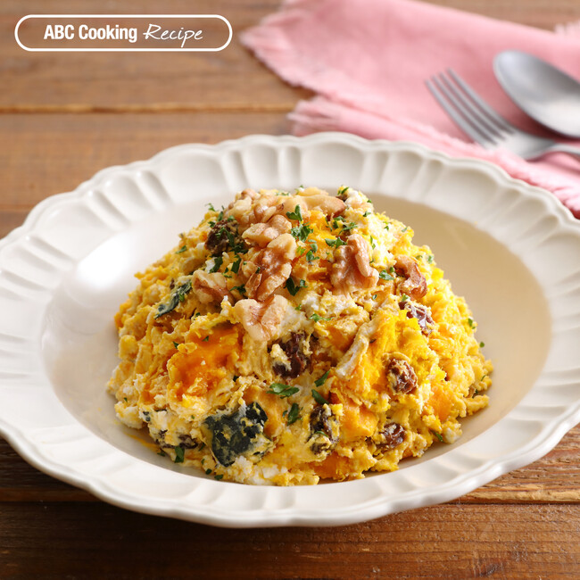 電子レンジで加熱したかぼちゃを軽くつぶし、生乳とクリームで作ったクリームチーズ・くるみ・レーズンと合わせたデリ風のサラダです。食塩不使用のクリームチーズを使用するため、かぼちゃやレーズンの甘さが引き立つ味わいになります。