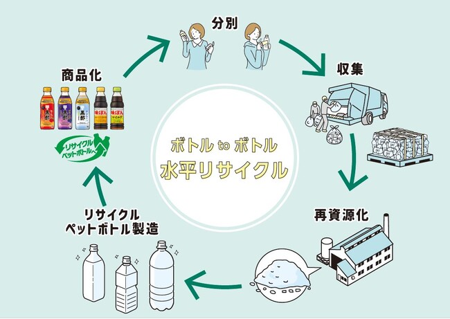 本協定により、東浦町において排出・回収される使用済みペットボトルを「ボトルtoボトル」水平リサイクルとして繰り返しリサイクルすることが可能になります。ミツカンはこのリサイクルペットボトルを一部商品に使用していきます。