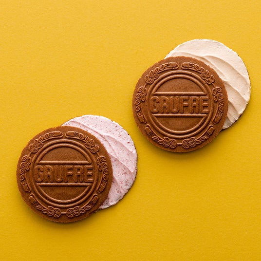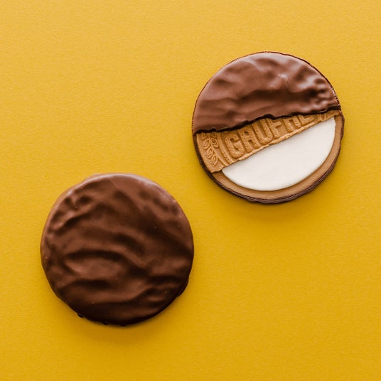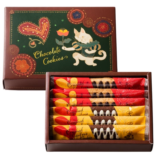 商品特長:ゴーフルウエハースを砕いたパウダーを使用したアーモンドクッキーにミルクチョコレート、チョコレートクッキーにホワイトチョコレートでデコレーションしました。