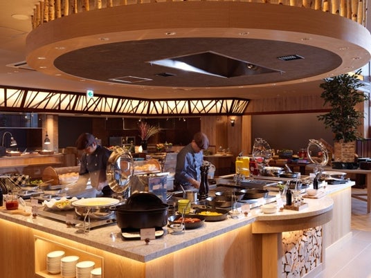 知床を楽しむKIKI知床のメインダイニング「ツリーサイドブッフェ」。アウトドアを彷彿とさせるセンターグリルはライブ感満載。味はもちろん、香りや焼き音、彩りからも魅力あふれる食事を、木の温もりに包まれた開放的な空間でお楽しみください。