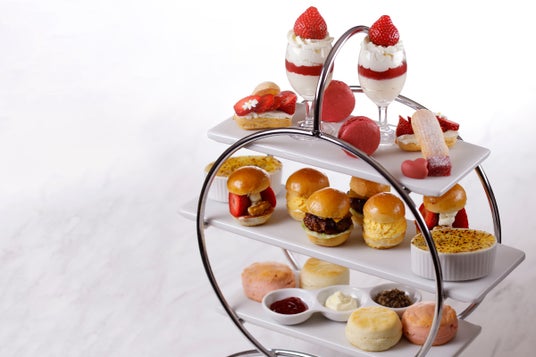 、ハートの苺チョコ、苺とクリームチーズの生ハムバーガー、トリュフバターのエッグバーガー、自家製ハンバーグのチーズバーガー、海老グラタン、スコーン2種(苺・プレーン)と、3種のディップ添え(タプナード・クロテッドクリーム、苺ジャム)、お好きなお飲み物(ティーカクテル・ワイン・ビール・ソフトドリンクの中からお選びいただけます)